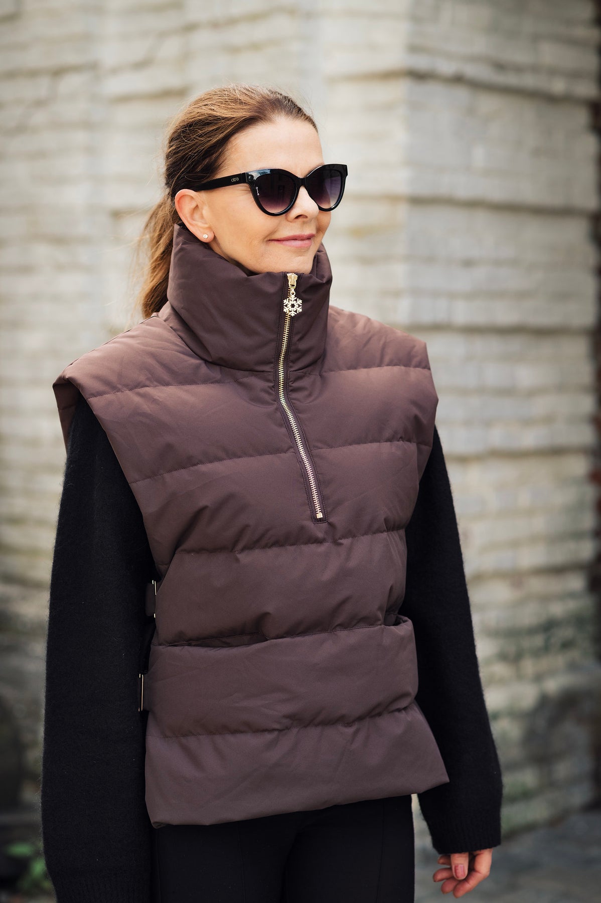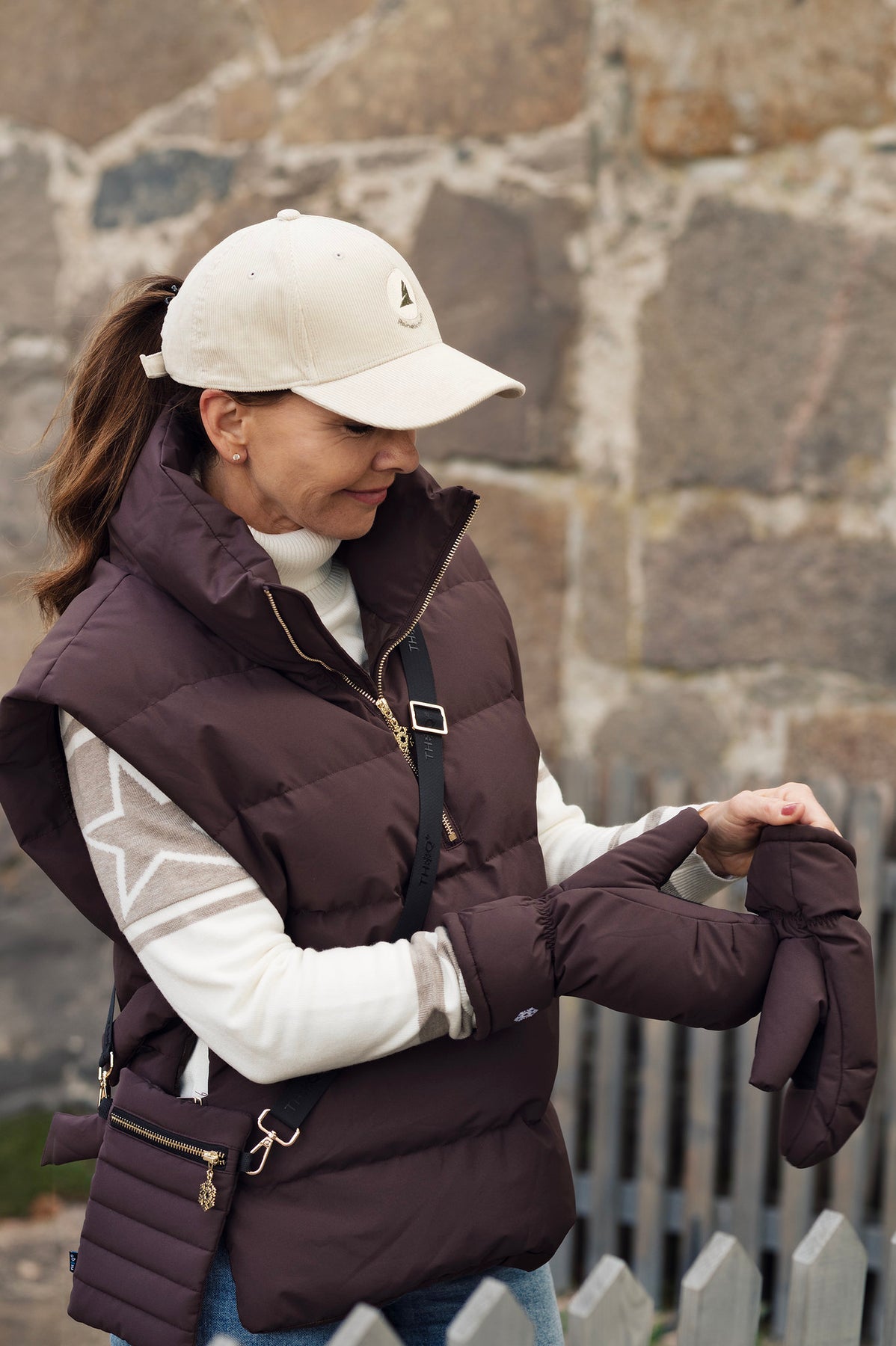 Superkul varm dunvest med høy lun krave,lang vest fra Thoq. Detaljer i gull.