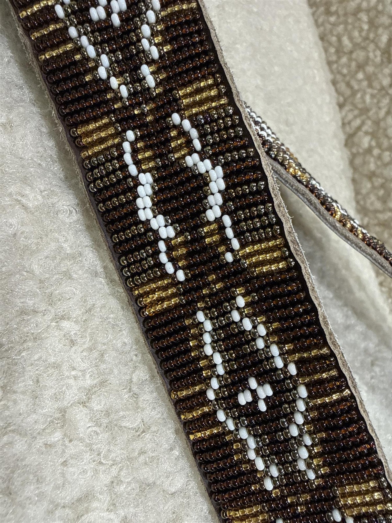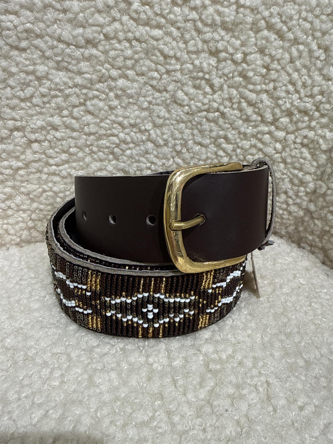Ordinær pris 1.499,00 krLekkert perlebesatt belte i brunt, gull og hvitt.