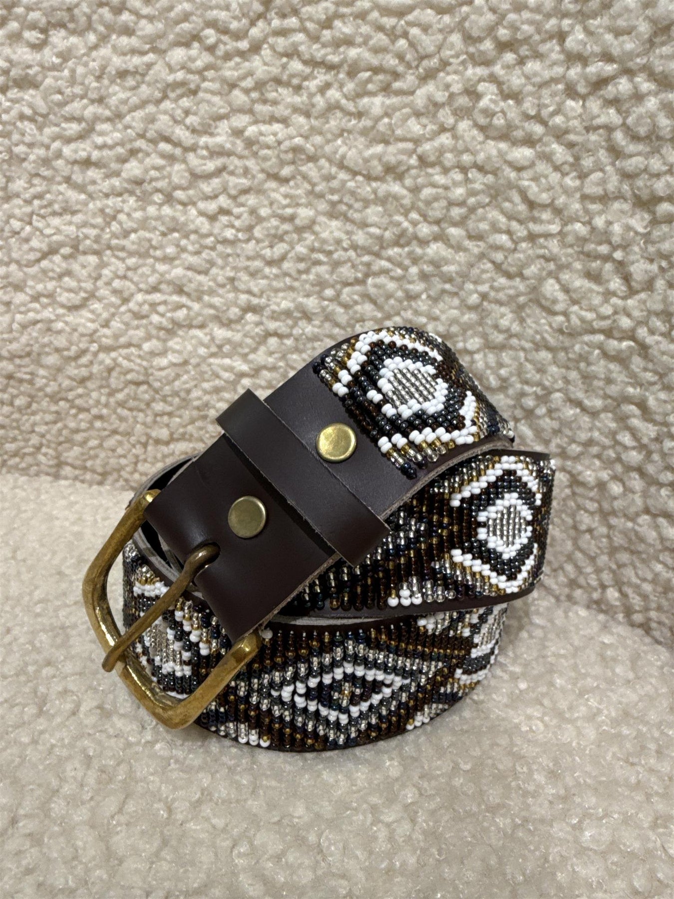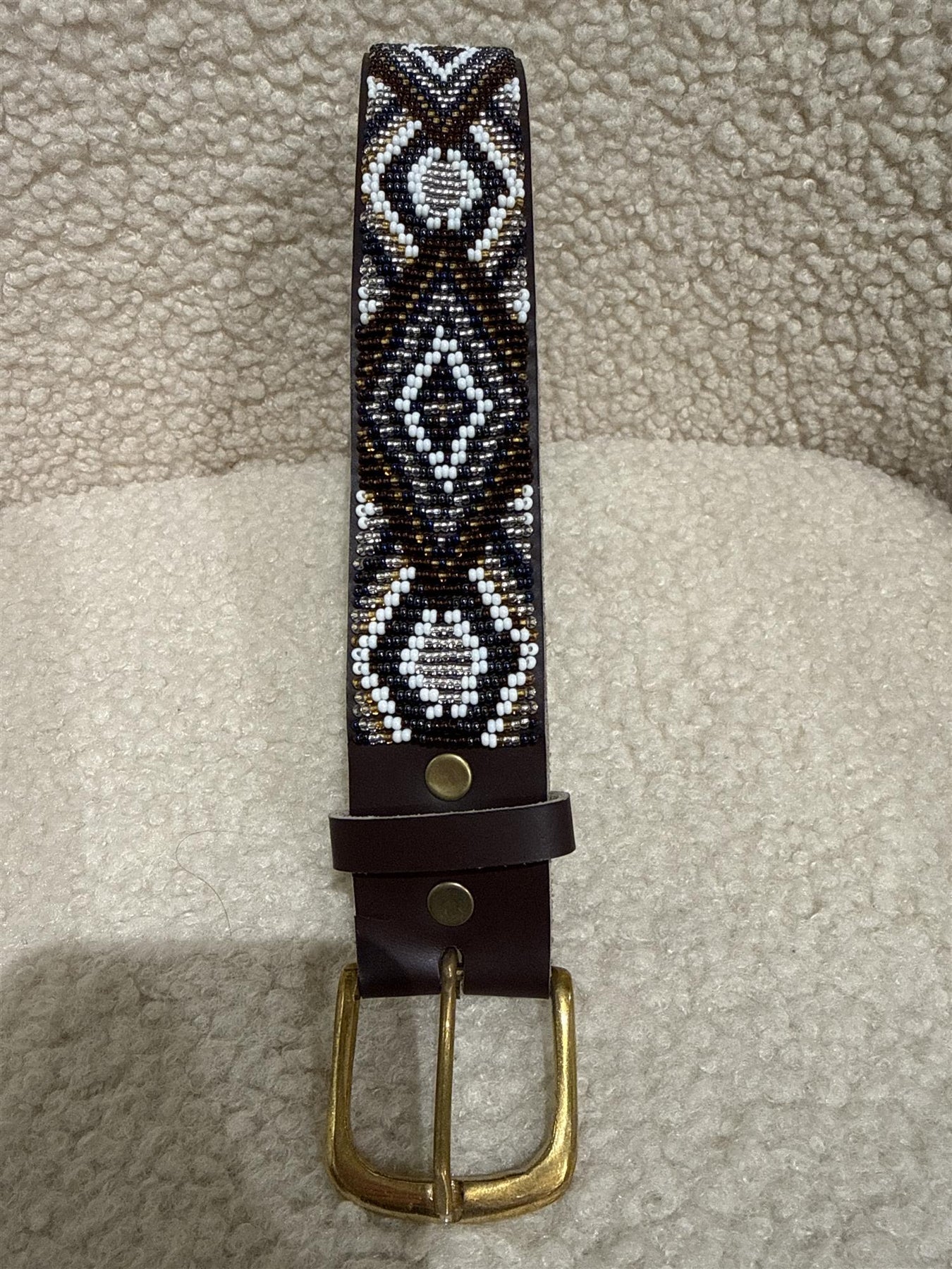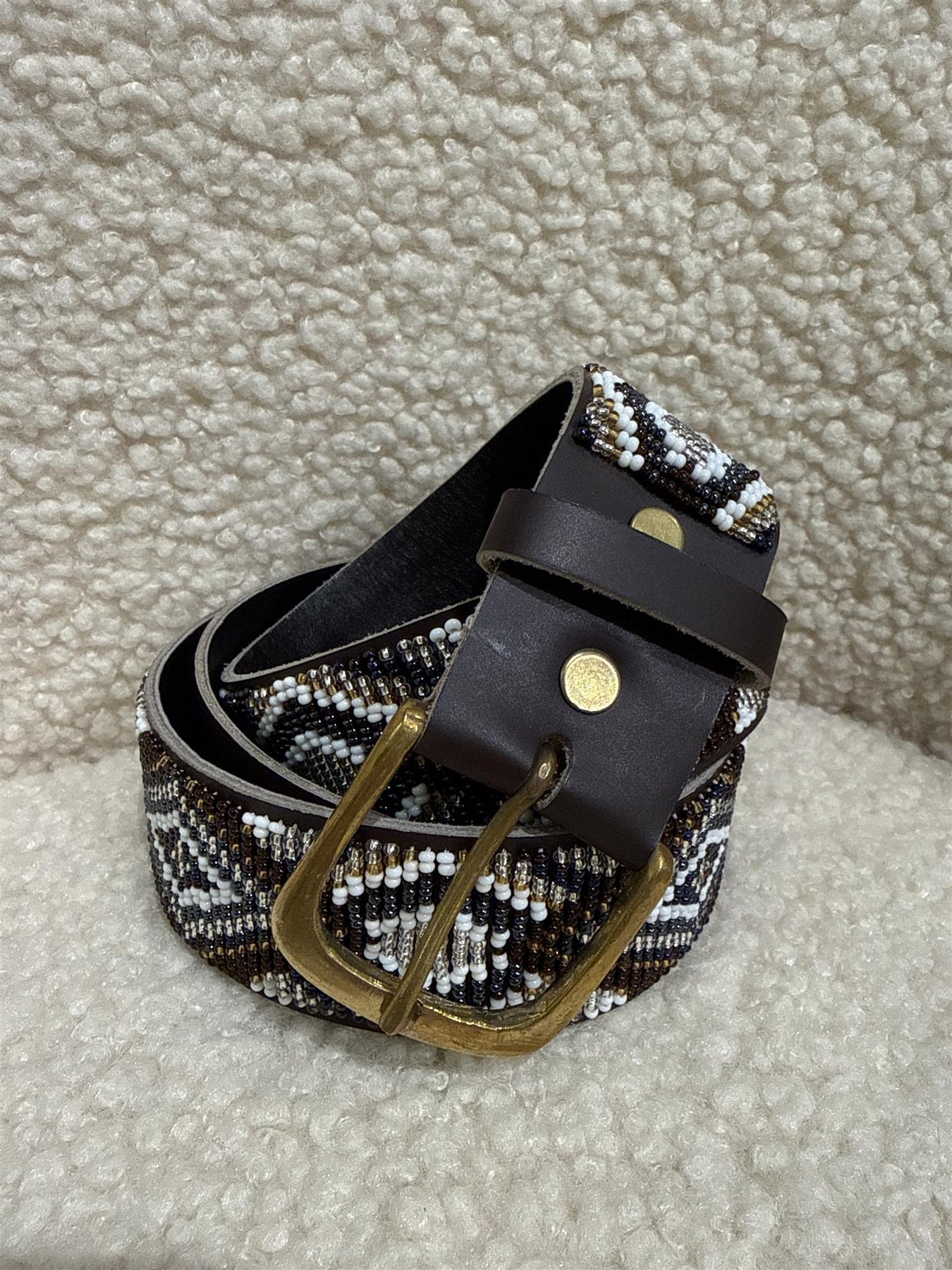 Perlebesatt belte i brunt, blått, hvitt og sølv.